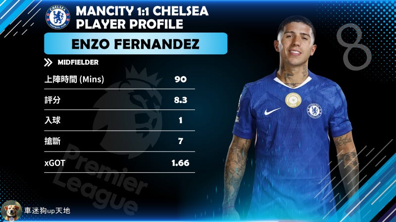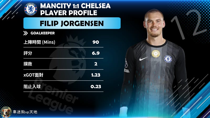 進攻端更加係佢表演嘅舞台。下半場麥費蘭將佢位置推前,佢即刻釋放巨大威脅。全場 xG+xA 高達 1.31,創造咗 2 次機會,xGOT(預期射正入球)高達 1.66,仲有 4 次殺入對方禁區觸球。補時 94 分鐘果一腳,冷靜補射入網,雖然過程有啲幸運,但機會係留畀有準備嘅人。入波後衝向球迷區慶祝嘅激情,正正係車路士而家最需要嘅熱血。