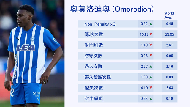 奧莫洛迪安身高194cm,強大的身體質素為佢提供左空中爭頂的優勢,呢個係佢的第一個優點。睇返數據,佢場均的空中爭頂次數係6.98次,數字上已經表明佢非常積極地參與空中爭頂。而因為多參與,所以贏的數字都相對地多,達到場均2.75次。不過效率就唔太好,勝率只有39.4%,所以可以話,佢有身高同空中爭頂的潛力,但係就需要更多的技術訓練去彌補不足的地方。