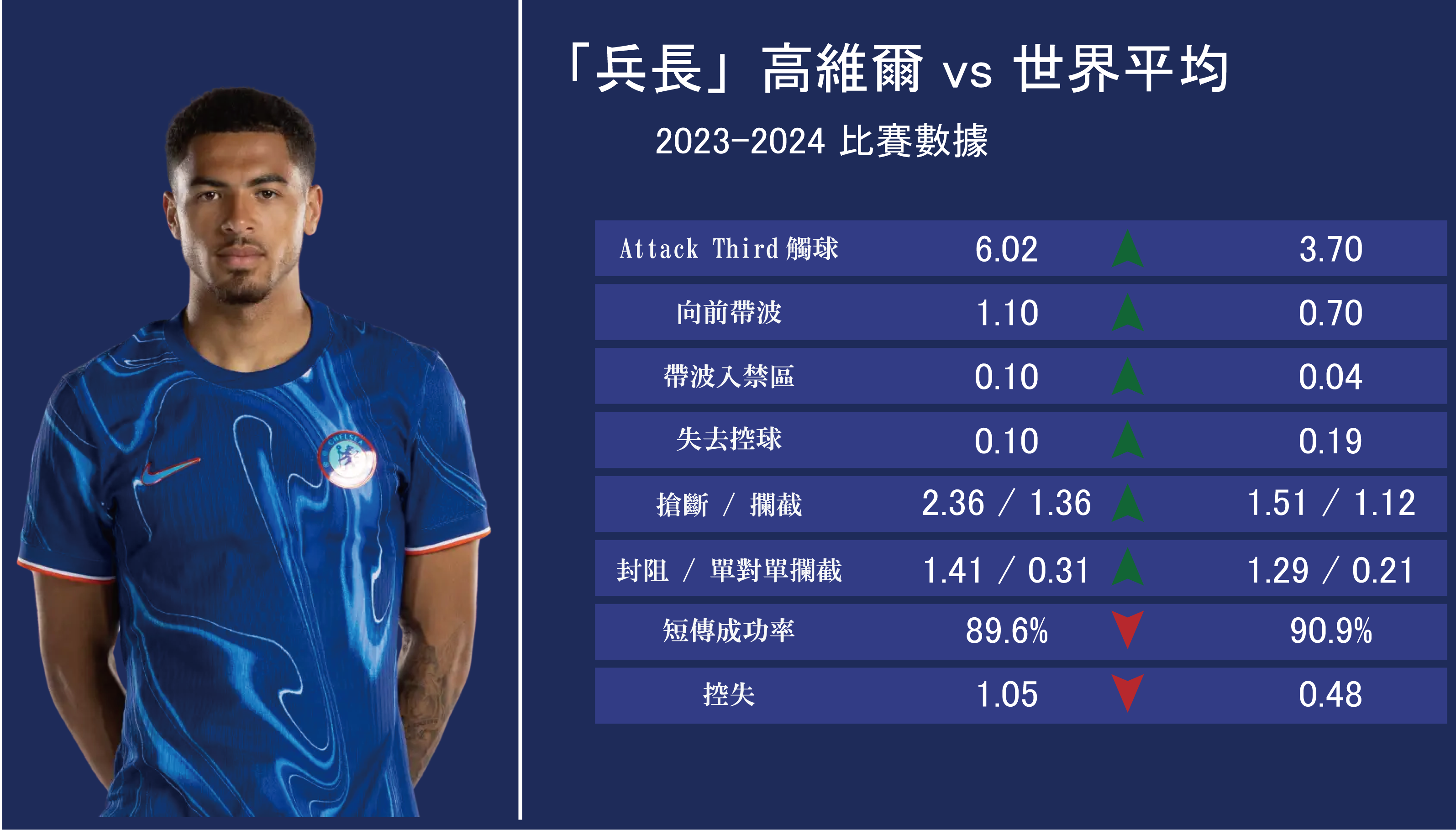 最後一項,基本上係年青球員都會有的問題。越後生第一腳控球就越差。高維爾的最大弱項就係Miscontrol問題,場均1.05領跑全世界(0.48)。雖然隊友同全隊的戰術會影響失球數字,但頂級的中堅仍然可以靠出色的防守將自己上陣場均失球壓係1以下,高維爾回歸車路士之後仍然係1.3(2023)同1.25(2024),係數據上仍然係唔好睇。