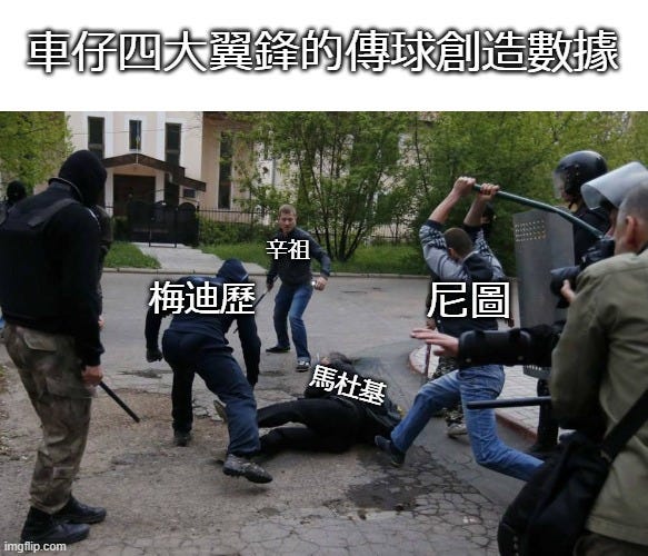 當然,講笑係咁講,馬杜基都唔係辛祖咁極端全零ge,例如係傳入1/3區域的數字上稍高過尼圖少少。傳入禁區的數字唔多但係都一樣碾壓左尼圖同梅迪歷。可惜係最關鍵的傳球創造數字上的確顯得疲弱。