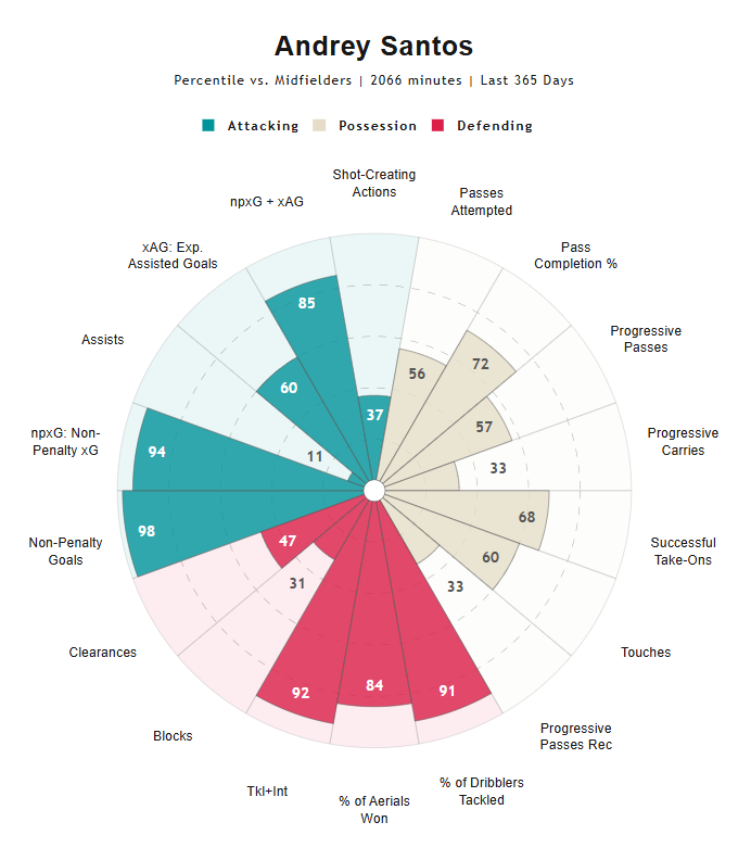 山度士人生暫時最高光果刻,一定要數佢係U20南美洲錦標賽中以6場入8球成為巴西奪冠功臣。攻門風格豪不花巧,既唔係用亮麗的技術過人扭空去射門,亦唔係好醒目咁走空位等隊友傳送,更加因為無短距離爆發速度,連突破越位的能力都唔高。佢的武器只有兩樣 - 禁區頂的高效反搶同把握力。