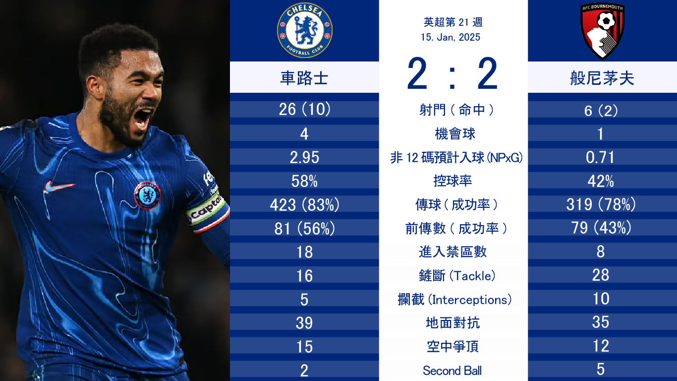 補時第5分鐘,占士主射禁區頂自由球,個波越過人牆直掛死角,幫車路士逼和。呢個入球亦係占士自2022年8月之後首次喺英超的入波。