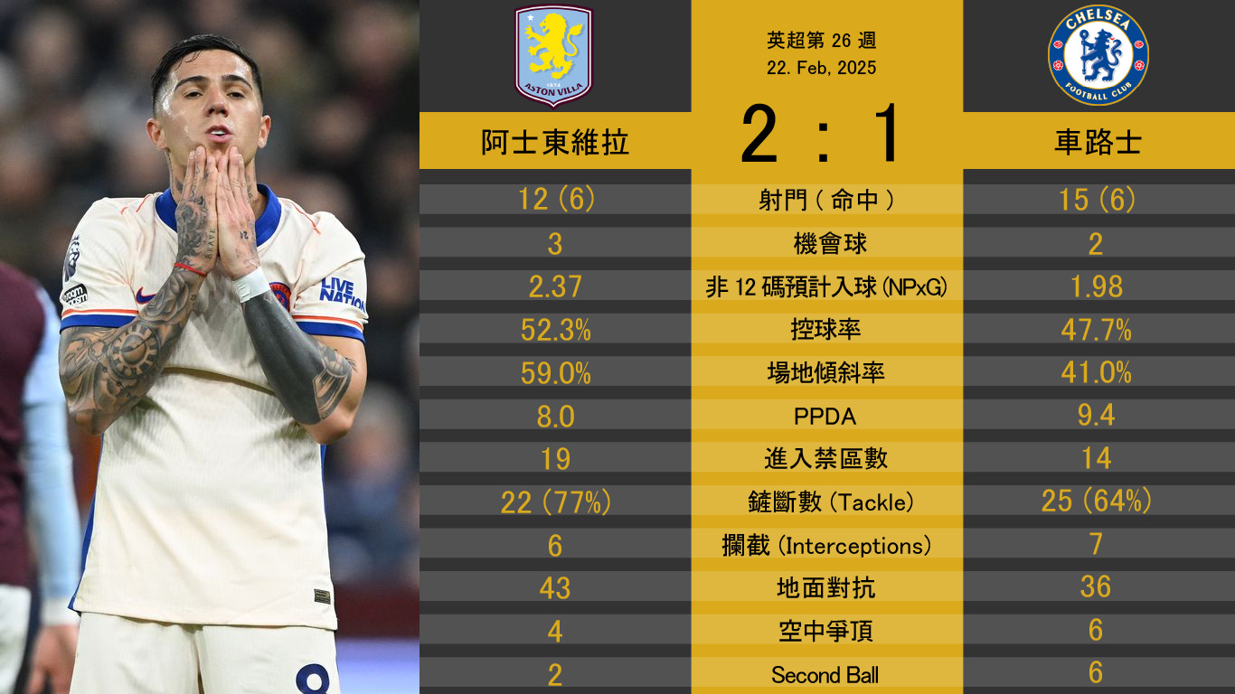 3) 戰術同陣容深度的隱憂:維拉半場換人後,艾馬利嘅高位壓迫策略(PPDA 8.0、High Turnovers 5次)完全壓制咗車路士中後場,自聖誕節後車路士客場連續五場進攻效率低於xG 2.0 (對葉仔2.0,對水晶宮1.2,對曼城1.8,對白禮頓0.5,對維拉1.98),今場再證明馬蛇嘅B計劃失蹤。