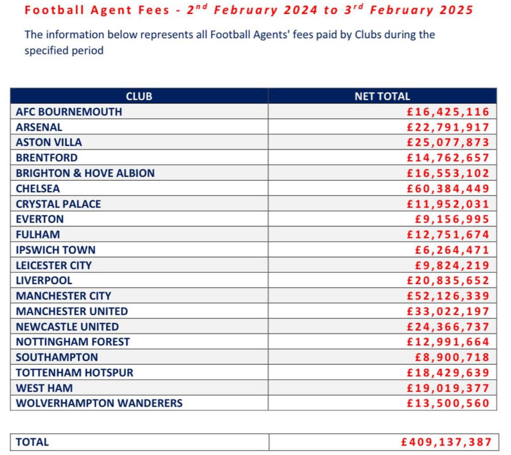 「買人緊要還,要俾錢中介。」最新由英格蘭足總 (FA) 公布嘅數據顯示,由 2024 年 2 月到 2025 年 2 月期間,車路士俾咗高達 £60.38m 嘅費用俾足球經理人 (Football Agents)!無錯,係六千萬鎊!呢個數字再次「蟬聯」英超榜首,大幅拋離第二位嘅曼城 (£52.1m),接近多咗成千萬鎊。如果再睇埋對上一期 (2023 年 2 月至 2024 年 2 月) 嘅數據,車仔俾嘅 Agent Fee 更加係誇張嘅 £75.14m!