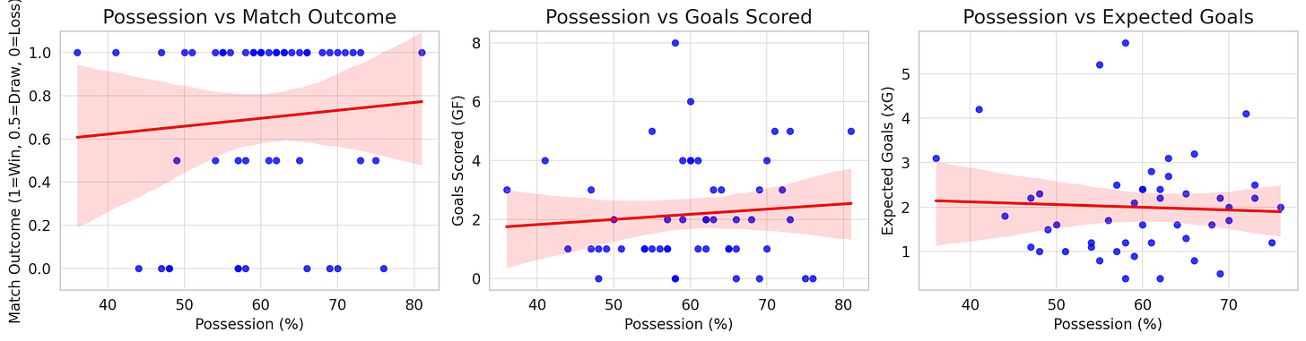 睇到呢度,你可能會話:「唓!咁即係話控球率冇Q用啦,淨係睇對手就得啦!」咪住先,GPT嘅「法證」工作仲未完!為咗真正拆解「控球率本身」對我哋有咩影響,GPT做咗個更「屈機」嘅分析。