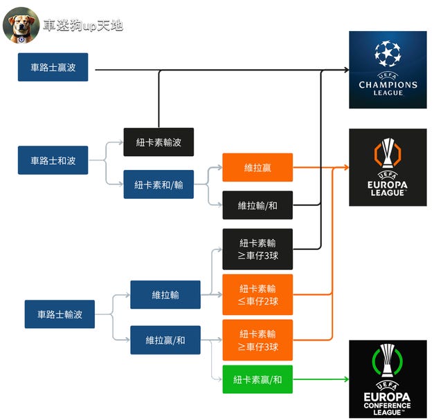 好喇,戲玉嚟喇!我哋可以將車路士喺煞科日嘅命運歸納為以下幾種主要情況,先上圖再睇字: